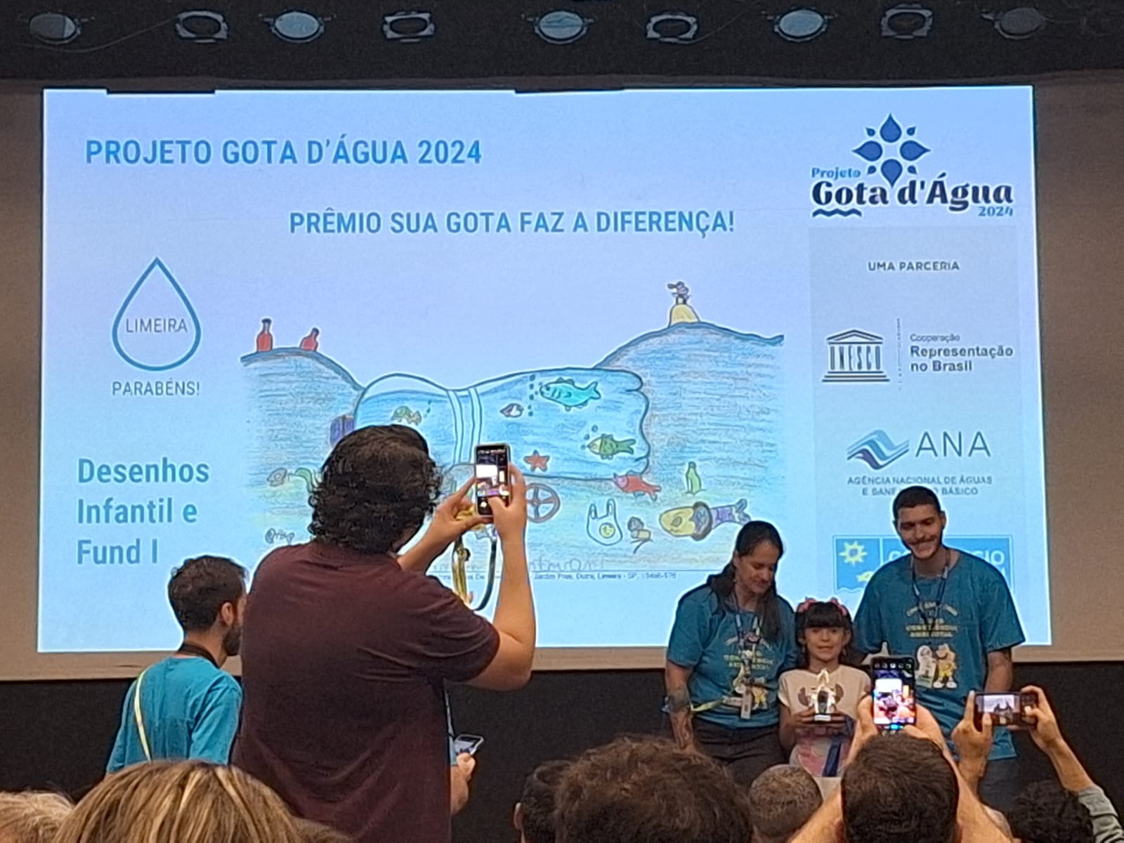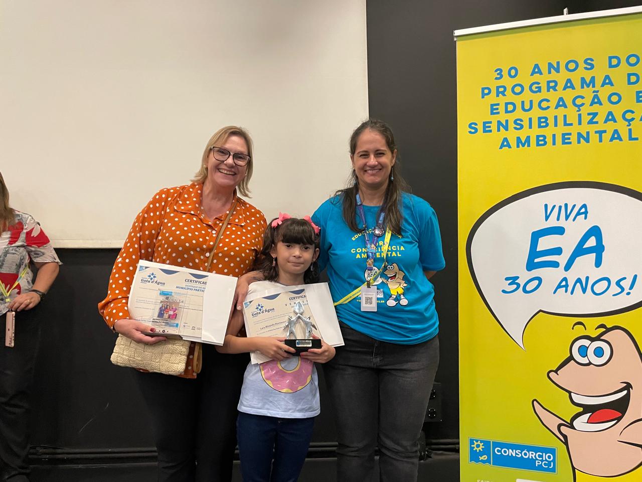 Uma estudante de 7 anos, do Ceief Rafael Affonso Leite, que integra a Rede Municipal de Educação de Limeira, venceu o prêmio “Sua Gota Faz a Diferença 2024”, na categoria desenho (Infantil e Fundamental I), do Consórcio das Bacias dos rios Piracicaba, Capivari e Jundiaí (Consórcio PCJ). A cerimônia de premiação, que ainda teve outras duas categorias (vídeo e podcast), ocorreu na sexta-feira (8), no Sesc Piracicaba, durante o Seminário de Avaliação do Projeto Gota d’Água. No evento, a secretária de Meio Ambiente e Agricultura, Simone Zambuzi, representou a Prefeitura de Limeira.