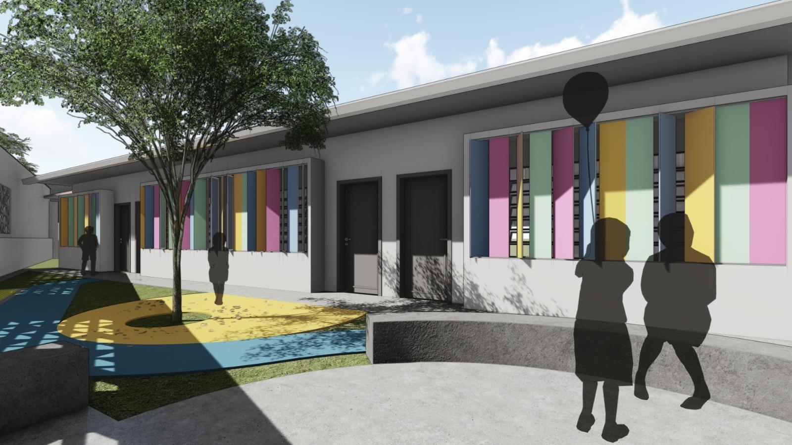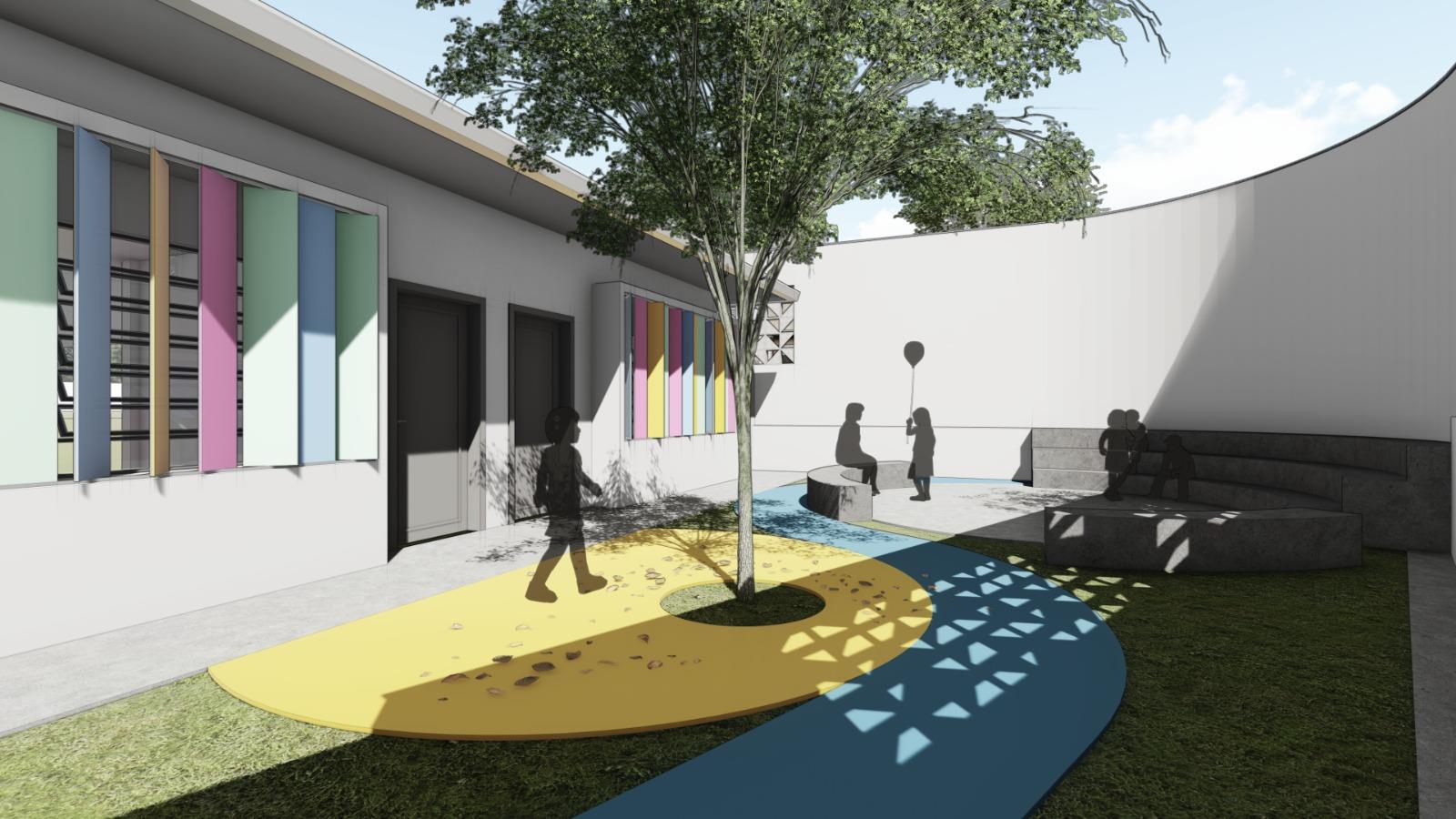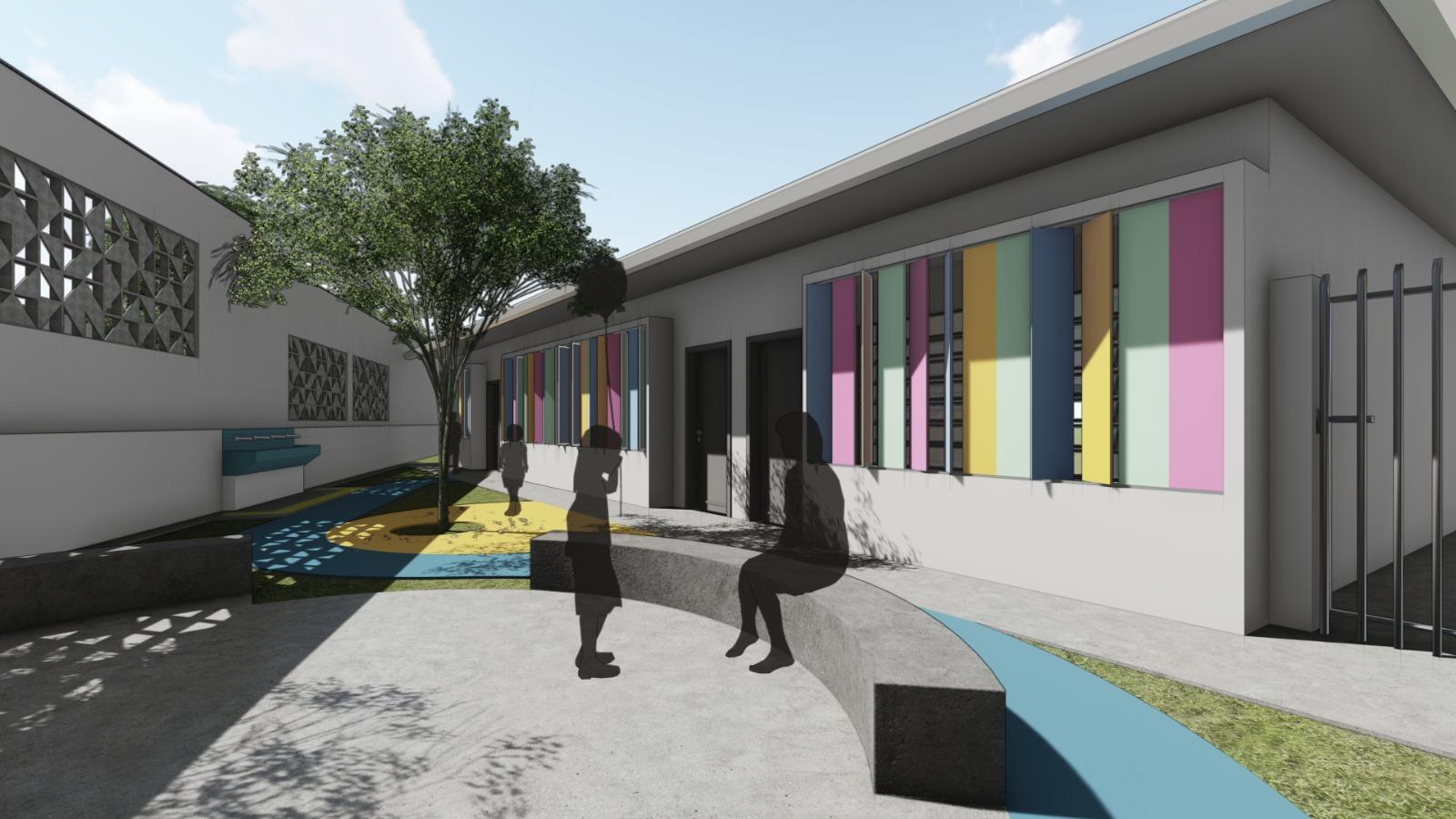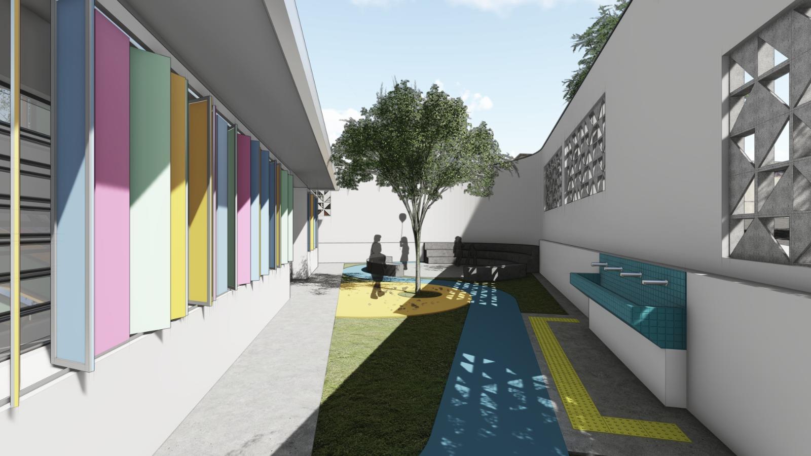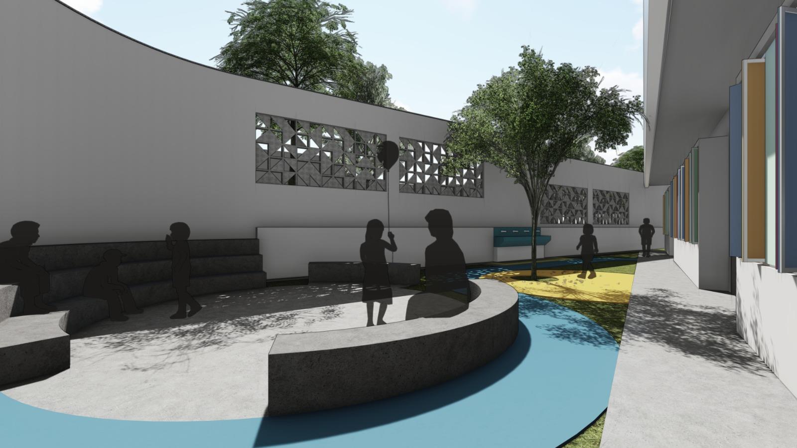 Os espaços de convivência também ganharão um novo conceito. O pátio coberto será revitalizado e o prédio passará a contar com três pátios ao ar livre, planejados para atender diferentes faixas etárias. Dois deles terão miniarquibancadas, ideais para rodas de conversa e atividades coletivas, estimulando a socialização e a criatividade. Já o terceiro pátio terá piso de borracha drenante com formas lúdicas, pequenas elevações e áreas de areia, criando um cenário que convida ao movimento e à interação.