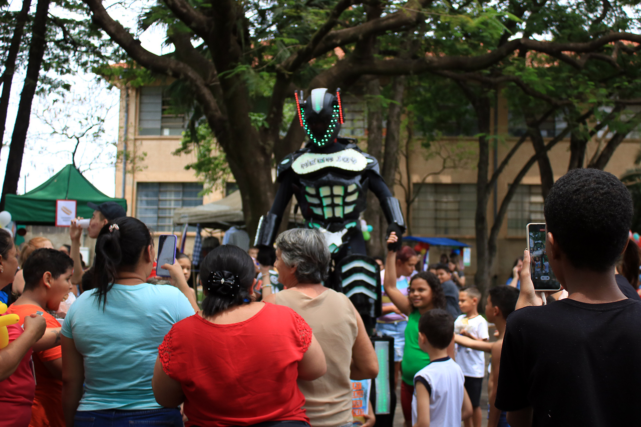 A decoração dos jardins ganhou reforço com os quadros do artista e usuário do Caps AD, Benedito Gabriel, que em breve irá inaugurar uma exposição no Paço Municipal. Já o ponto alto da festa foi a presença de um robô de led de quase 3 metros de altura, que percorreu todo o espaço, tirou foto e dançou ao lado das crianças. O robô foi cedido pela Joy Produções.